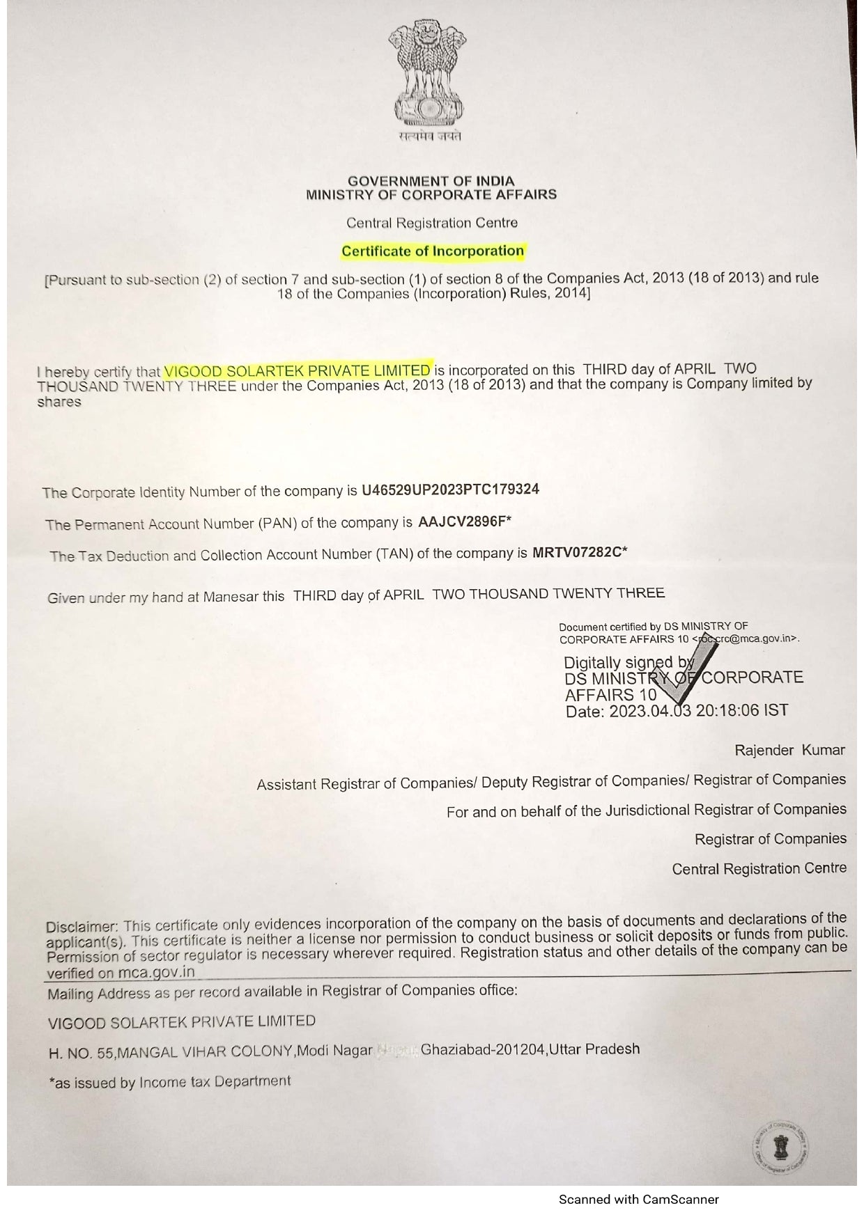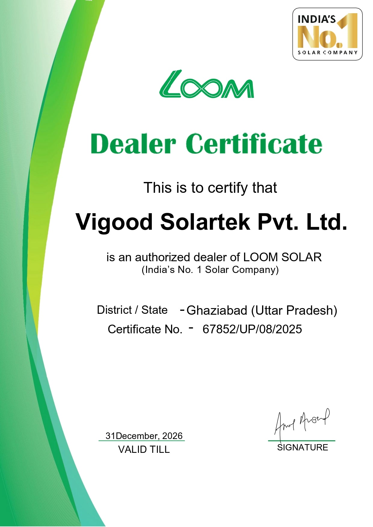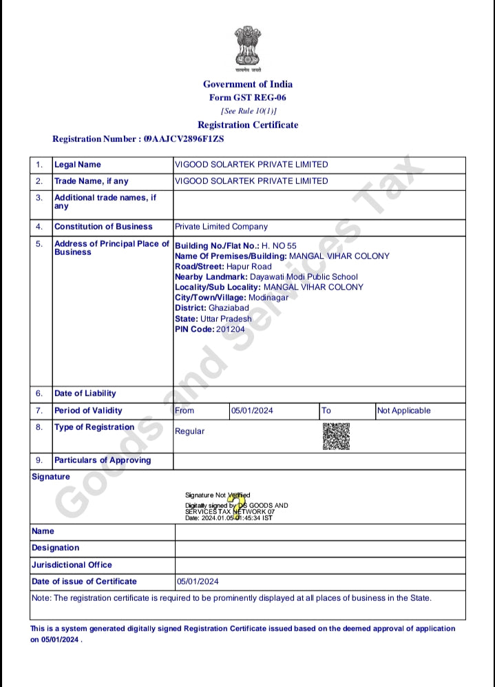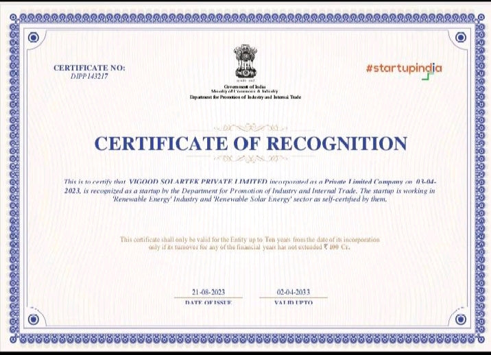 Vigood Solartek is a India's No -1 Growing Solar Manufacturing Company. The company is registered with the Corporate Identification Number: U46529UP2023PTC179324 which is started by two friends Vimal Kumar & Guddu Kumar Ex- Employee of Loom Solar. We have wide range of Mono Perc Half-Cut Bifacial Solar Panel, Solar Inverter, Solar Battery, VFD & Solar Installation Kit. Company is located on Modinagar, Ghaziabad, UP. It is an ISO 9001-2015 certified company and recognised startup by Goverment Of India.